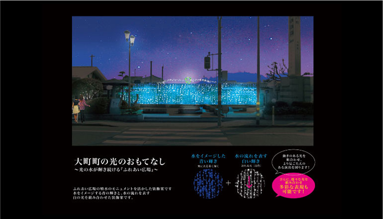 噴水のモニュメントを活かし、青と白の光を組み合わせて光の水が輝くような装飾を施しました。